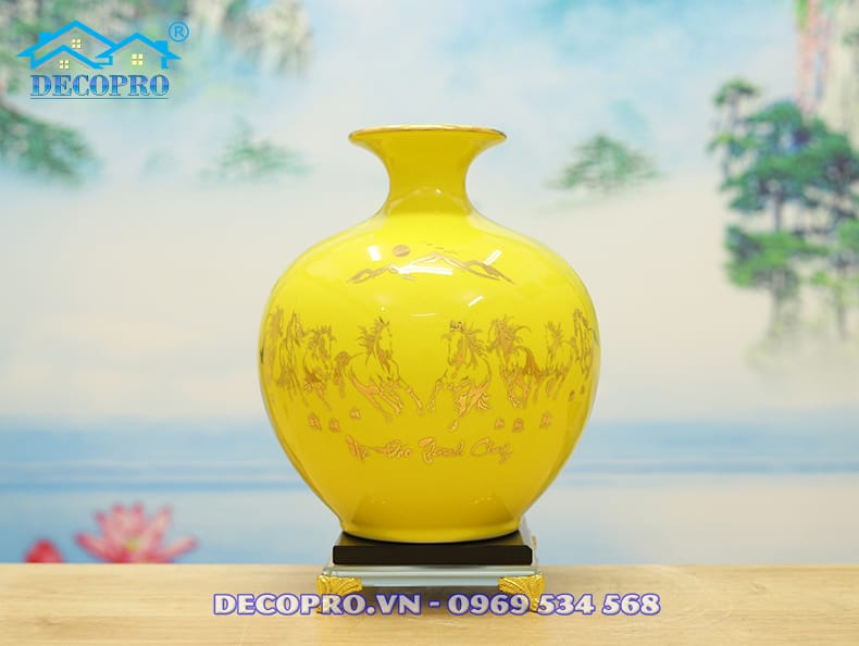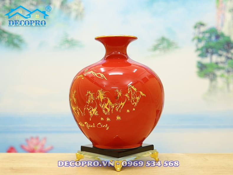 Sản phẩm được chế tác hoàn toàn thủ công tại làng nghề gốm sứ Bát Tràng danh tiếng. Với hình dáng đặc trưng “miệng rộng, cổ thắt, thân phình”, chiếc bình là “vũ khí” phong thủy giúp thu hút vượng khí và giữ gìn tài sản không bị thất thoát. Họa tiết 8 chú ngựa phi nước đại (Bát Mã) được đắp nổi hoặc vẽ tay tỉ mỉ, tượng trưng cho sự đoàn kết, tốc chiến tốc thắng trong kinh doanh và sự nghiệp.