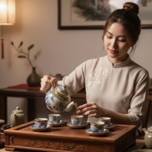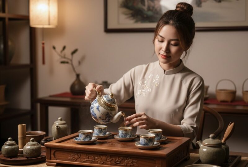 Sản phẩm được làm từ gốm sứ Bát Tràng cao cấp, nung ở nhiệt độ trên 1200°C, loại bỏ hoàn toàn tạp chất độc hại. Nhờ đó, bộ ấm chén đảm bảo an toàn cho sức khỏe người sử dụng, giữ trọn hương vị tinh khiết của trà. Đồng thời, khả năng giữ nhiệt tốt giúp trà luôn ấm nóng, mang lại trải nghiệm thưởng trà trọn vẹn.